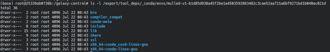 Then, I start a container. Log in as admin, under Dependencies I see that all my tools have the green flag, dependencies are met. The mulled environments are physically there. When I try to launch a tool, though, it returns an error, saying "Not a conda environment", and showing me the path of the mulled environment. Observations: