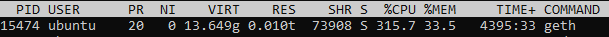 eth_call query throughput and latency, where the queries typically hit a lot of DeFi contract logic. I have a 64-bit Linux box with 32 GB of RAM. Using geth 1.9.15, my config.toml has DatabaseCache = 24000, but the geth process never uses more than ~ 13 GB virtual / ~ 10 GB resident RAM even after a week of traffic. Shouldn't I expect something around 24 GB usage? Are there other settings I should tweak?